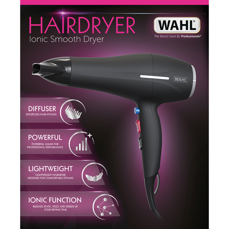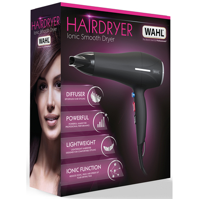 The Wahl Ionic Smooth Hairdryer is designed to deliver professional quality performance with ionic function and tourmaline grille for shinier, healthier-looking hair.