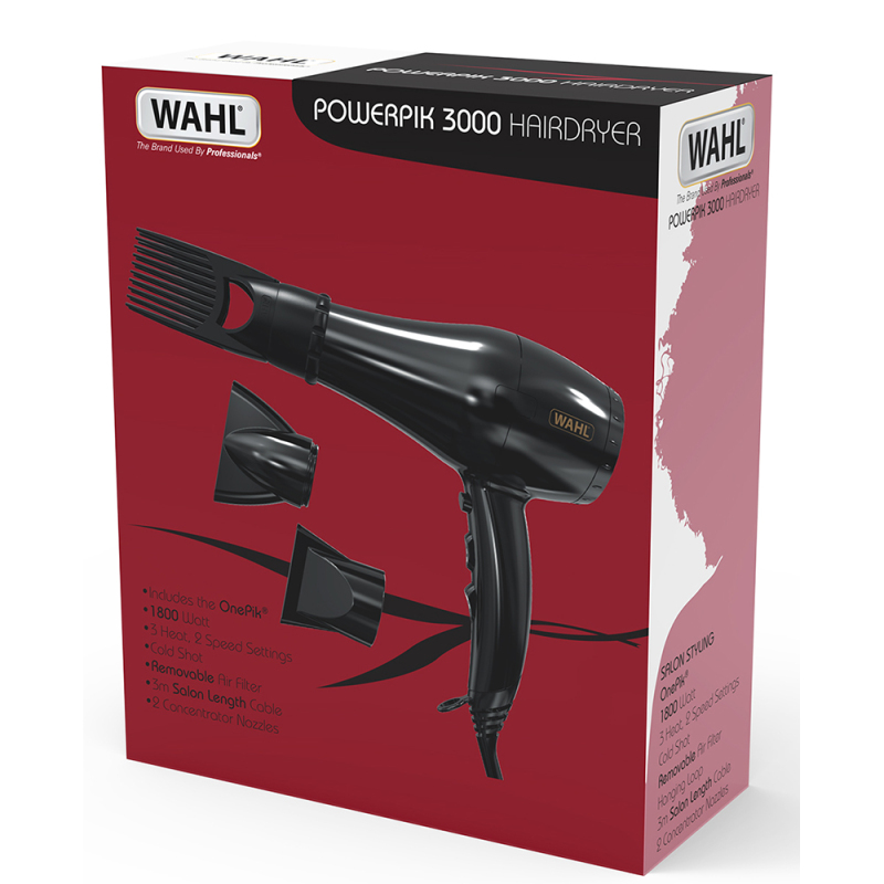 Designed for Afro-Caribbean hair types, the Wahl Powerpik 3000 Hair Dryer delivers 1800W of powerful performance with three heat and two-speed settings, as well as a cold shot to set your style; giving you maximum styling control and ultrafast drying results, perfect for Afro-Caribbean hair types.