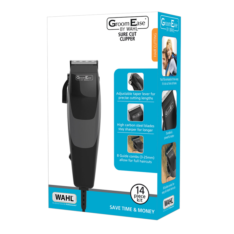 Home hair cutting could not be easier with the Sure Cut Clipper. The high carbon steel blades enable precision cutting whilst ensuring the clipper glides easily through the hair. Eight easily attachable guide combs (#1-8) and a thumb adjustable taper lever allow for a greater variation in cutting lengths ranging from 3mm to 25mm.This clipper is mains operated for non-stop powerful clipping so that once you’ve finished doing your own hair, you can do the whole families too.Featuring long-lasting, precision ground, high carbon steel blades to give you a superior cutting experience, designed so that your blades stay sharper for longer.