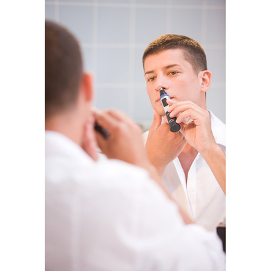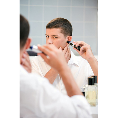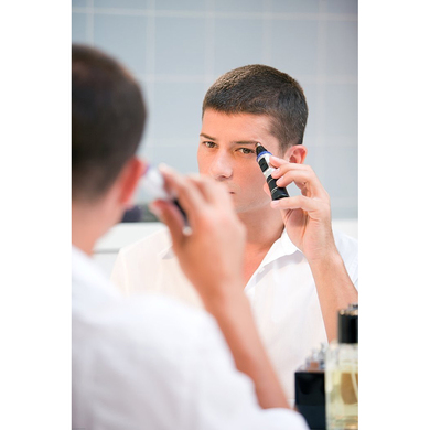 The trimmer’s dual-edge blade cuts hairs which enter the trimmer from not only the sides but also the top which makes it perfect from trimming individual stray hairs on the eyebrows or for beard detailing. Curved, hypo-allergenic stainless steel blades leave the correct amount of hairs for natural filtering.