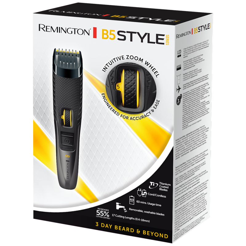 Perfect your look with the Style Series B5 Beard Trimmer. The Titanium Coated, Self-Sharpening Blades, and Anti-Slip Textured Tip make for comfortable, controlled grooming. While the Intuitive Zoom Wheel is engineered for both accuracy and ease, so you can effortlessly switch between hair lengths from 0.4-18mm.