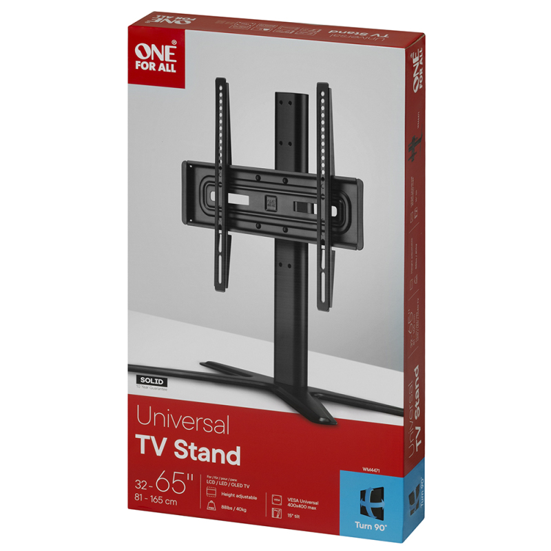 Cast from high-grade material, this easy to assemble Tabletop will hold any TV between 32" and 65" weighing up to 40 kg. All mounting materials are delivered with the Tabletop for a simple setup.