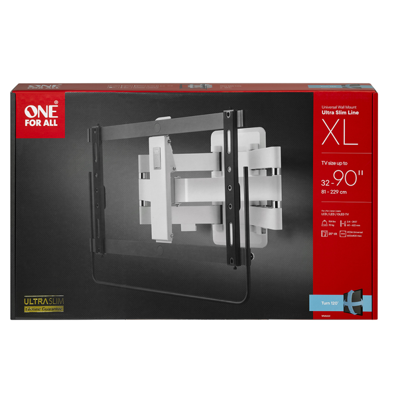 The Ultra Slim XL combines a sturdy and unobtrusive design, smart engineering and high-quality materials. Designed especially for bigger and heavier screens, this innovative bracket holds up to 70 kg and is suitable for TVs up to 90”.