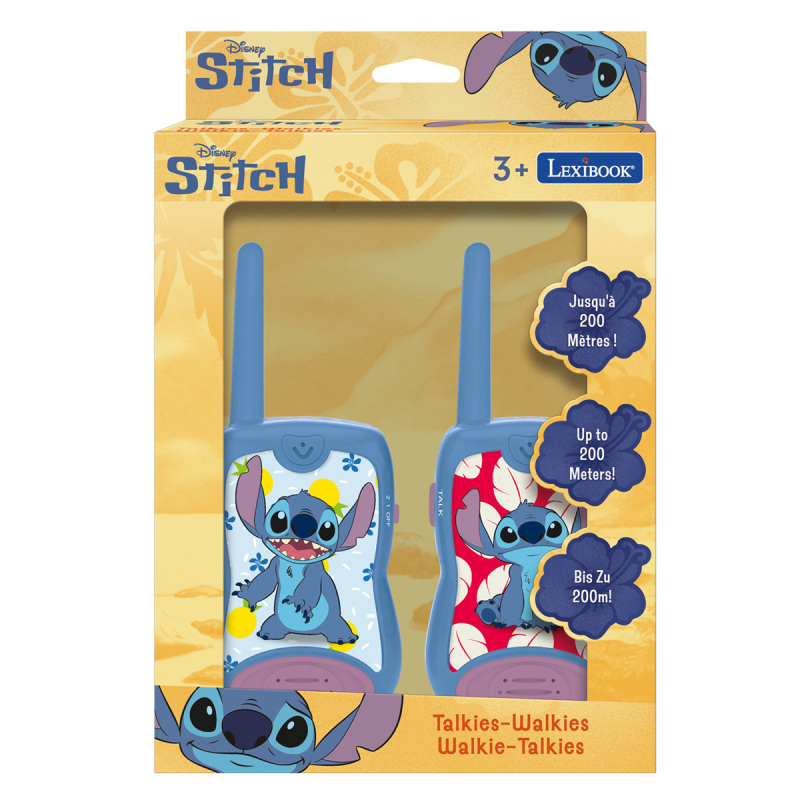 Immerse yourself in the world of adventure with Lexibook Stitch walkie talkies! With a transmission range of up to 200m outdoors, stay in touch wherever you go, Featuring iconic Stitch images, these uniquely designed walkie talkies are perfect for younger Lilo&Stitch fans, Lexibook Stitch walkie talkies are designed to provide an interactive play experience, Equipped with 2 communication channels, they allow for engaging team missions and role-playing games, The convenient belt clip allows you to keep them close at hand, freeing your hands for adventure, Sustainability is a priority with Lexibook walkie-talkies. Enjoy peace of mind with a 2-year warranty, The solid materials ensure prolonged use, while the captivating design stimulates children's imagination. Don't settle for simple toys, give your kids an exceptional communication experience with Lexibook Stitch walkie talkies