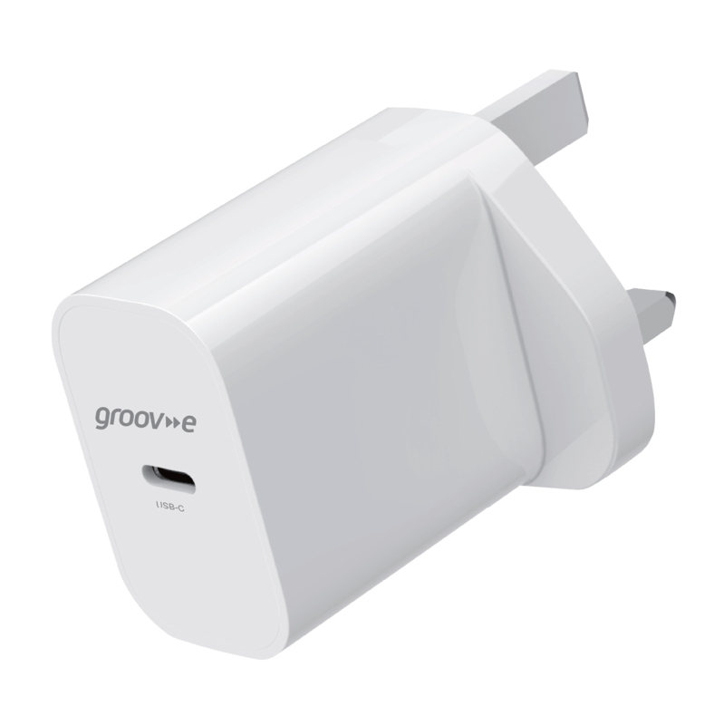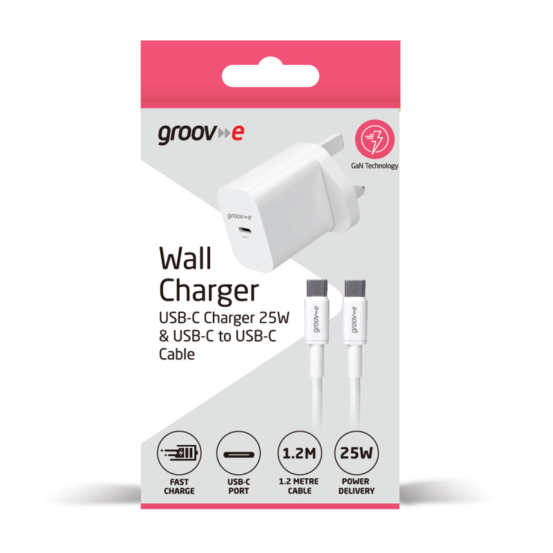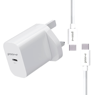 Groov-e GVMA112WE, USB-C Wall Charger 25W with USB-C to USB-C Cable - White