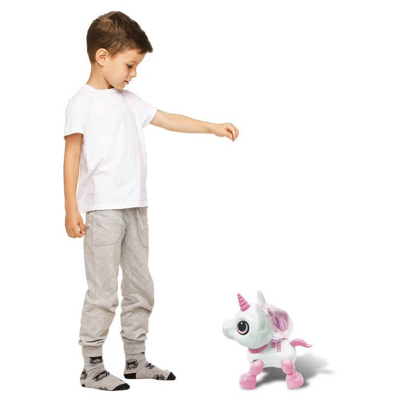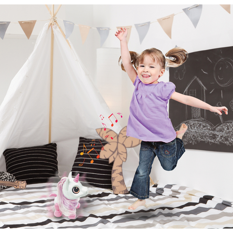 A new companion for hours of play! Easy to use! By turning its head forward, center or back, the little unicorn will move! 3 different play modes are included!