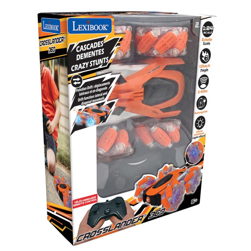 The Crosslander 360° + is a bright, rechargeable 4-wheel radio-controlled car. Thanks to the all-terrain wheels and ergonomic remote control, you can steer your car in any direction and perform 360° rotations! Let it perform its best tricks with its "double face" and "drift" functions for lateral and diagonal movements for hours of play at speeds of up to 12 km/h.Let her show you what she can do!