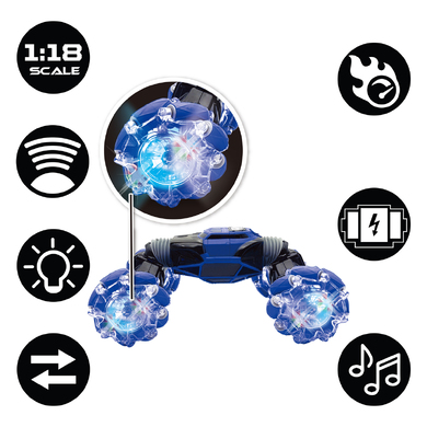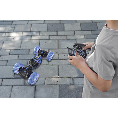 "An amazing stunt car with wrist motion control! 2 control modes: either with the remote control of with the motion control bracelet! Motion control: the car moves forward, backward or sideward depending on your hand placement thanks to the motion sensor built inside the bracelet! Demo mode for insane moves! Scale 1/16. Amazing light effect on the car. Rechargeable battery (for the car and the wrist control). Charging time: 2.5-3 hours (car) and 1 hour (wrist control). Micro-USB cables provided. Working time: 20 minutes (car) and 8 hours (wrist control). Frequency: 2.4 GHz. Warranty: 2 years. Designed and developed in Europe - Made in China