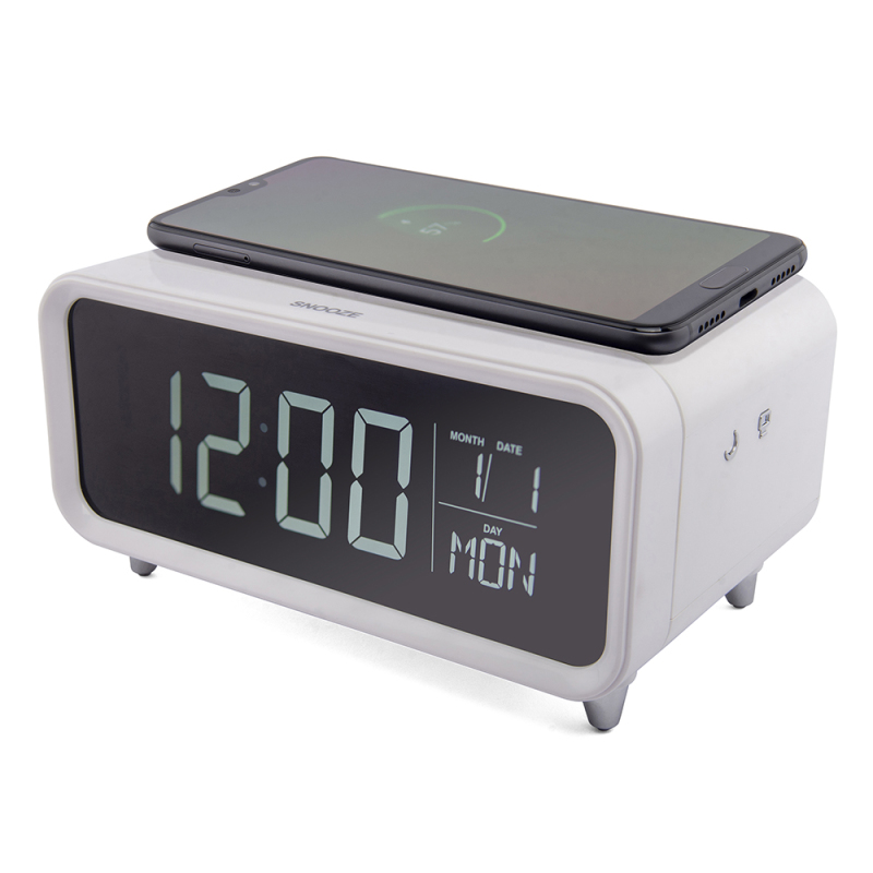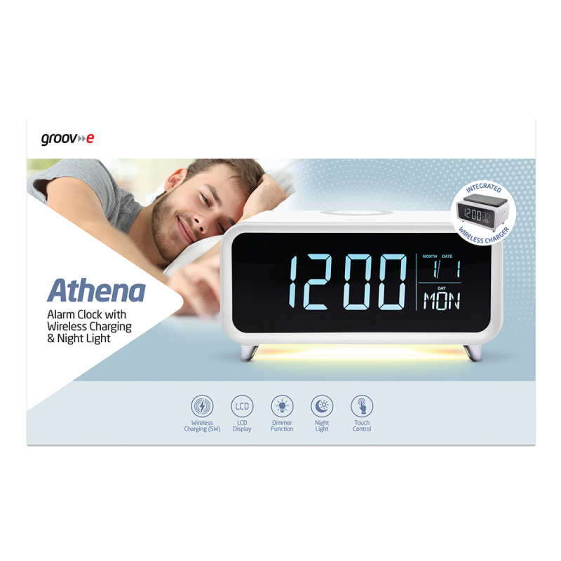 Alarm clock with a built-in 5W wireless charging pad and dimmable night light. The Groov-e Athena is a bedside alarm with a difference.